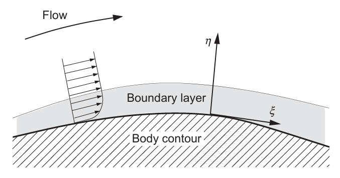 在模拟高雷诺数下的绕体流动时(即边界层相对于特征尺度很薄),Navier-Stokes方程(2.19)可以简化。一个必要条件是:不存在大范围的边界层分离。此时可预期,只有沿物体表面法向方向的流动量梯度(图2.4中的$\eta$方向)对粘性应力有贡献$[40,41]$。另一方面,在计算剪应力张量(式(2.14)与式(2.15))时,可忽略其他坐标方向(图2.4中的$\xi$)上的梯度。这称为Navier-Stokes方程的薄剪切层(TSL)近似。TSL修正的动机在于:粘性项的数值计算将更省计算量,同时在假设成立的范围内仍能保持足够精度。从实践角度也可为TSL近似辩护:在高雷诺数流动中,为正确解析边界层,网格在壁面法向必须非常细;受限于计算机内存与速度,其他方向不得不采用更粗网格,这会导致相对于法向方向而言梯度计算的数值精度显著降低。为完整起见,TSL方程在A.6节给出。由于二次流(例如叶栅中的二次流)无法得到恰当分辨,TSL简化通常只用于外流气动问题。