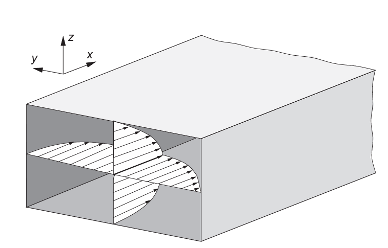 控制方程(2.19)可简化为一种称为抛物化Navier-Stokes(PNS)方程的形式$[8,42-44]$。上述条件允许我们在粘性应力项(式(2.15))中令$u$、$v$与$w$对主流向的导数为零。此外,还将主流向上的粘性应力张量$\overline{\tau}$分量、由其所做功$(\overline{\tau}\cdot\vec{v})$以及热传导$k\nabla T$从式(2.23)的粘性通量向量中略去。连续方程以及对流通量(式(2.21))保持不变。细节见A.7节。对图2.5所示主流方向与$x$坐标一致的情形,可证明PNS近似得到一组抛物/椭圆混合型方程:主流向的动量方程与能量方程为抛物型,因此可沿$x$方向推进求解;而$y$与$z$方向的动量方程为椭圆型,必须在每个$x$截面内迭代求解。因此,PNS方法的主要收益在于显著降低了求解复杂性——从完整三维场问题变为一系列二维问题。PNS方程的典型应用包括管道与通道内流动的计算,以及利用空间推进方法模拟定常超声速流动$[45-48]$。