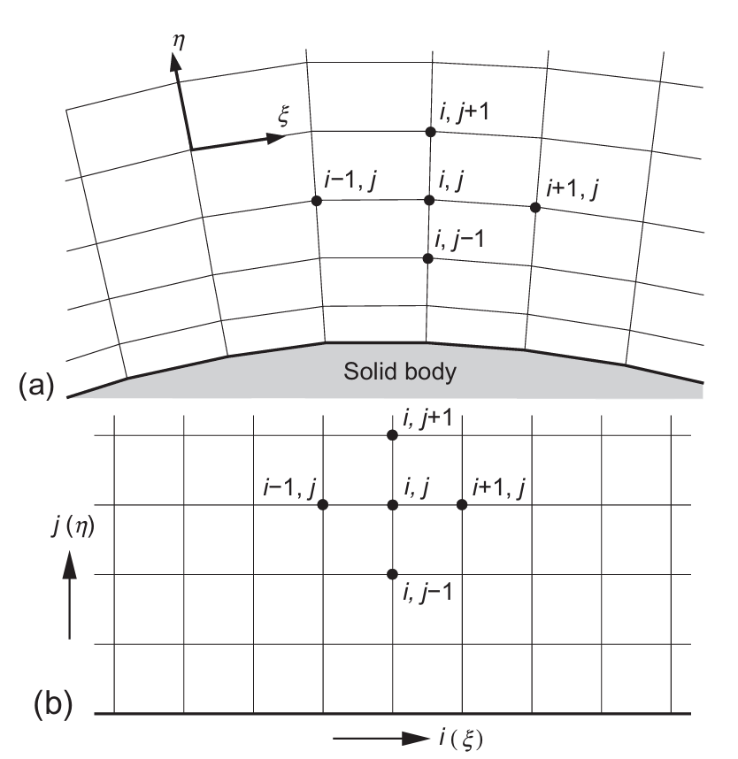 图3.2 结构化贴体的网格方法(2D):(a)展示了物理空间;(b)展示了计算空间;ξ和η表示曲线坐标系