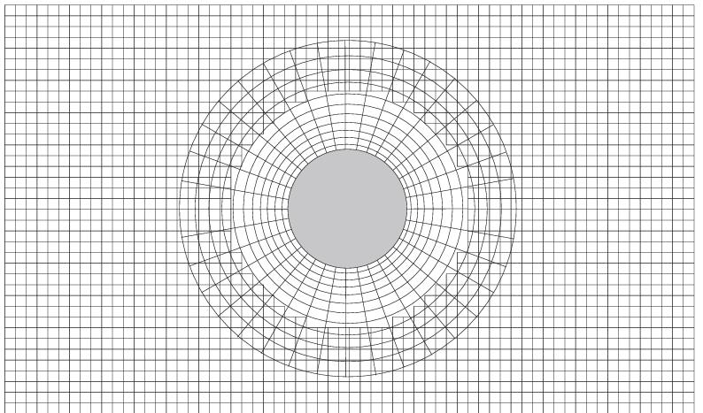 与块结构网格相关的另一种方法是Chimera技术$[39–46]$。其基本思想是:先分别在域内每个几何实体周围独立生成网格,然后将这些网格组合,使它们在交界处相互重叠。图3.5给出了简单构型的示意。关键操作是在重叠区域内在不同网格间准确传递物理量,因此重叠范围会根据所需插值阶数进行调整。相较于多块方法,Chimera的优点在于:各网格可完全独立生成,无需显式处理网格界面;其问题在于:控制方程的守恒性质在重叠区域内无法严格满足。将该方法扩展到非结构网格的研究见文献$^{[47,48]}$。