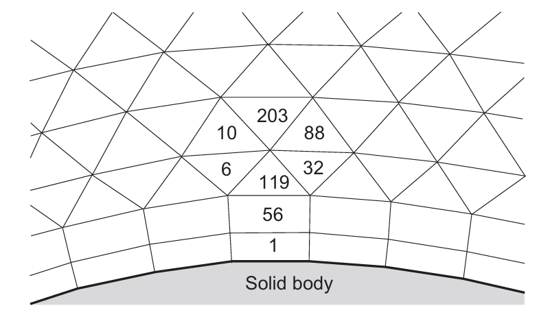 第二类网格是非结构网格。它们在处理复杂几何方面提供最大灵活性$[49]$。其主要优点在于:二维三角网格或三维四面体网格原则上可自动生成,与域的复杂性无关。当然在实践中仍需恰当设置参数以获得高质量网格。此外,为准确分辨边界层,通常建议在二维近壁使用矩形单元、在三维近壁使用棱柱体或六面体单元$[50–60]$。混合网格的另一个好处是减少网格单元、边、面以及可能的网格点数量。但也应注意:对几何要求很高的情况,混合网格生成并不简单。尽管如此,为复杂构型生成非结构混合网格所需时间通常仍显著少于多块结构网格。随着仿真几何保真度快速提高,快速且尽量少用户干预地生成网格变得愈发重要,工业环境尤甚。非结构网格的进一步优势是:基于解的网格加密与粗化可以相对自然、无缝地处理。非结构方法的缺点之一是:求解器内需要更复杂的数据结构,这类结构通常使用间接寻址,视硬件而定会降低计算效率;同时内存需求通常也高于结构格式。但尽管存在这些困难,短周转时间内处理复杂几何的能力仍更为重要。因此,例如几乎所有商业CFD软件供应商都已转向非结构求解器并不令人意外。关于非结构网格上空间与时间离散方法的综述见文献$[61]$。