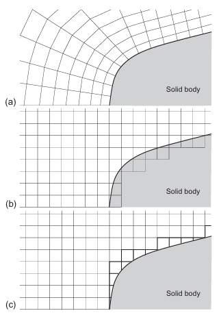 一方面,网格可以生成得紧贴物理空间边界,此时称为贴体网格(body-fitted grid)(图3.1a)。这种方法的主要优点是:在边界附近(例如固体表面上的剪切层)可以非常精确地分辨流动;其代价是网格生成工具的复杂度很高,尤其是在“真实工程”几何的情况下。另一方面,所谓笛卡尔网格(Cartesian grids)$[1-8]$ 的单元边与笛卡尔坐标轴平行,生成非常容易。它们的优点是:式(2.19)中的通量评估要比贴体网格简单得多。但从图3.1b或c可见,对边界的通用且精确的处理很难实现$[3]$。因此,贴体网格或组合方法(见11.2.4节)通常更受青睐,尤其是在工业环境中,因为被模拟构型的几何复杂度往往很高。